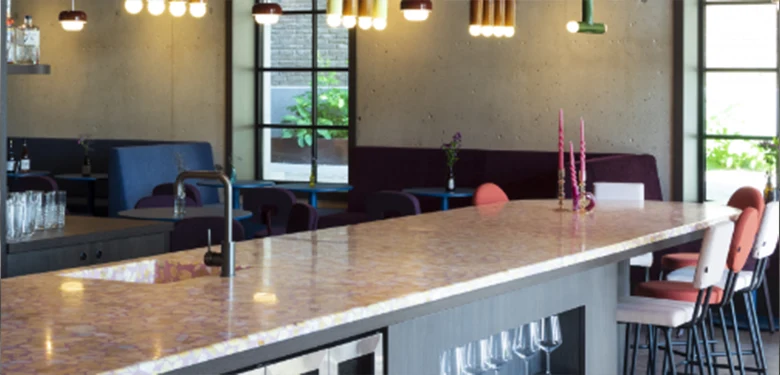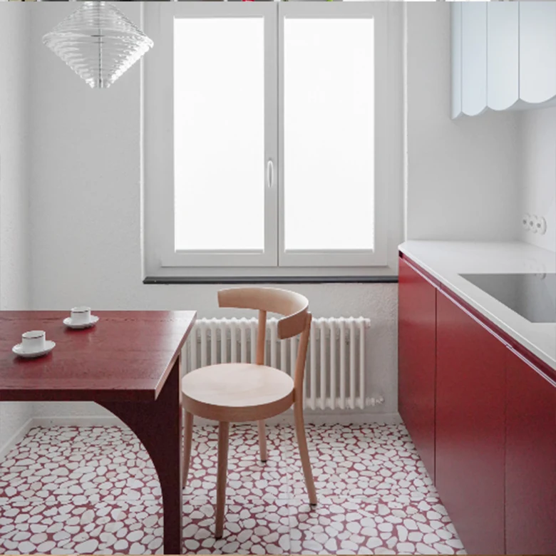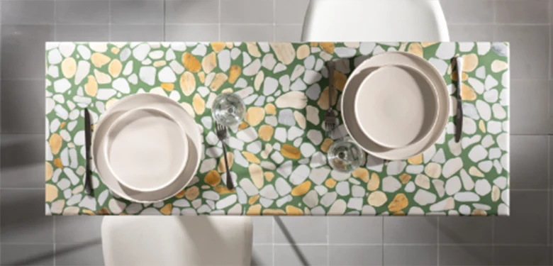 Een originele en exclusieve Terrazzo van de Mosaic Factory ateliers. Dit unieke materiaal stelt ons ook in staat om grootformaatplaten voor tafels en aanrechtbladen te produceren.