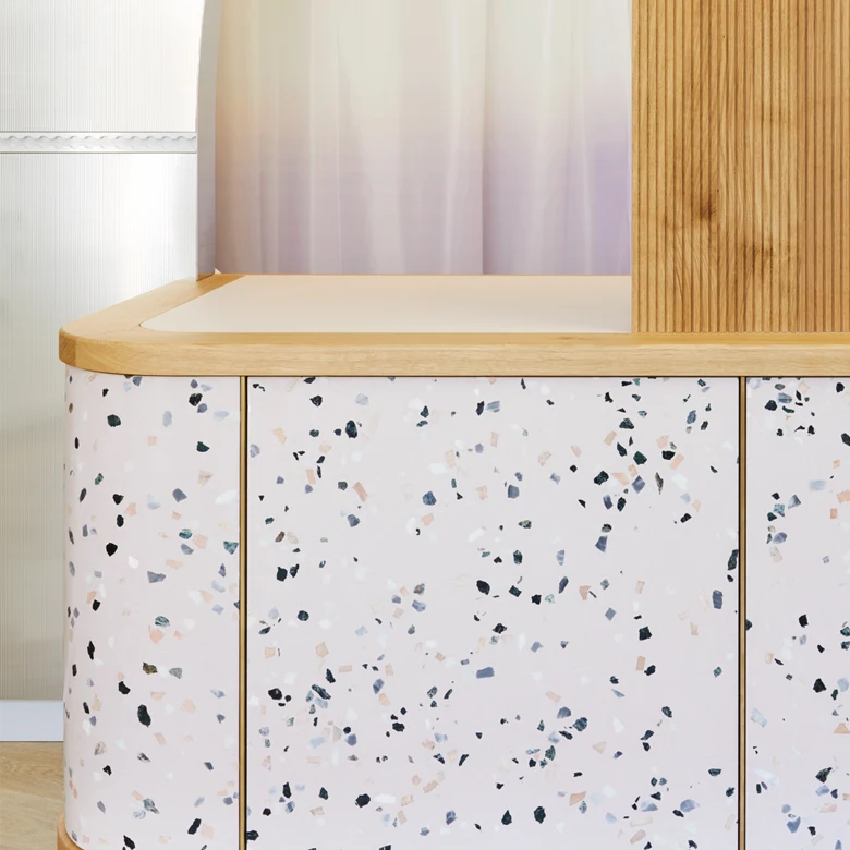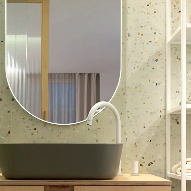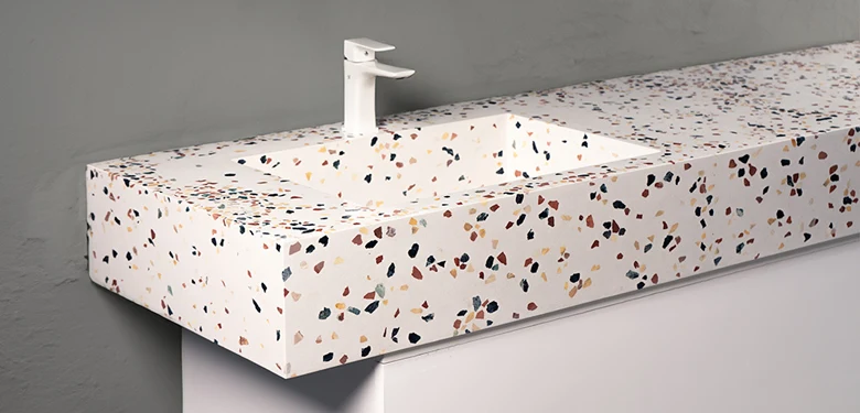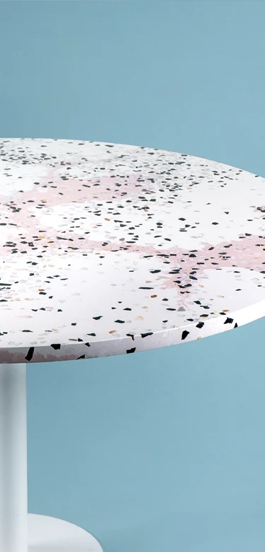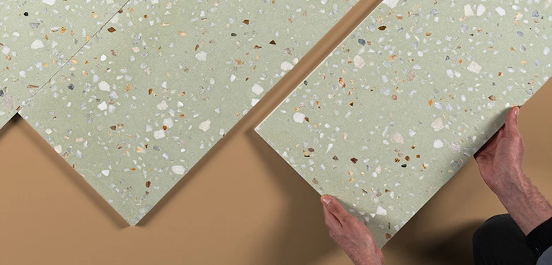 Gemaakt op een exclusieve hoogwaardige minerale basis (binder) van de Mosaic Factory ateliers, is deze Terrazzo beschikbaar in tegels en platen tot 230 cm met diktes van 16 tot 25 mm.